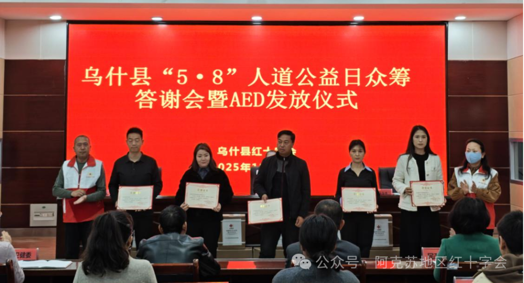 11月11日上午,乌什县“5·8”人道公益日众筹答谢会暨AED发放仪式在县委党校举行,10家捐赠企业及受赠单位、学校代表共50余人参加了会议。政府副县长、红十字会会长阿迪拉·艾合买提同志出席了会议。