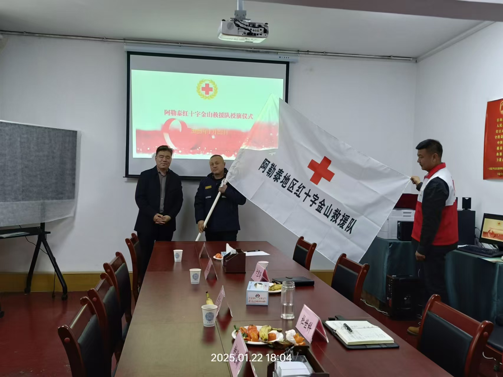 地区红十字会党组书记、常务副会长杜世科为金山救援队授旗,标志着金山救援队正式纳入阿勒泰地区红十字会应急救援力量体系。