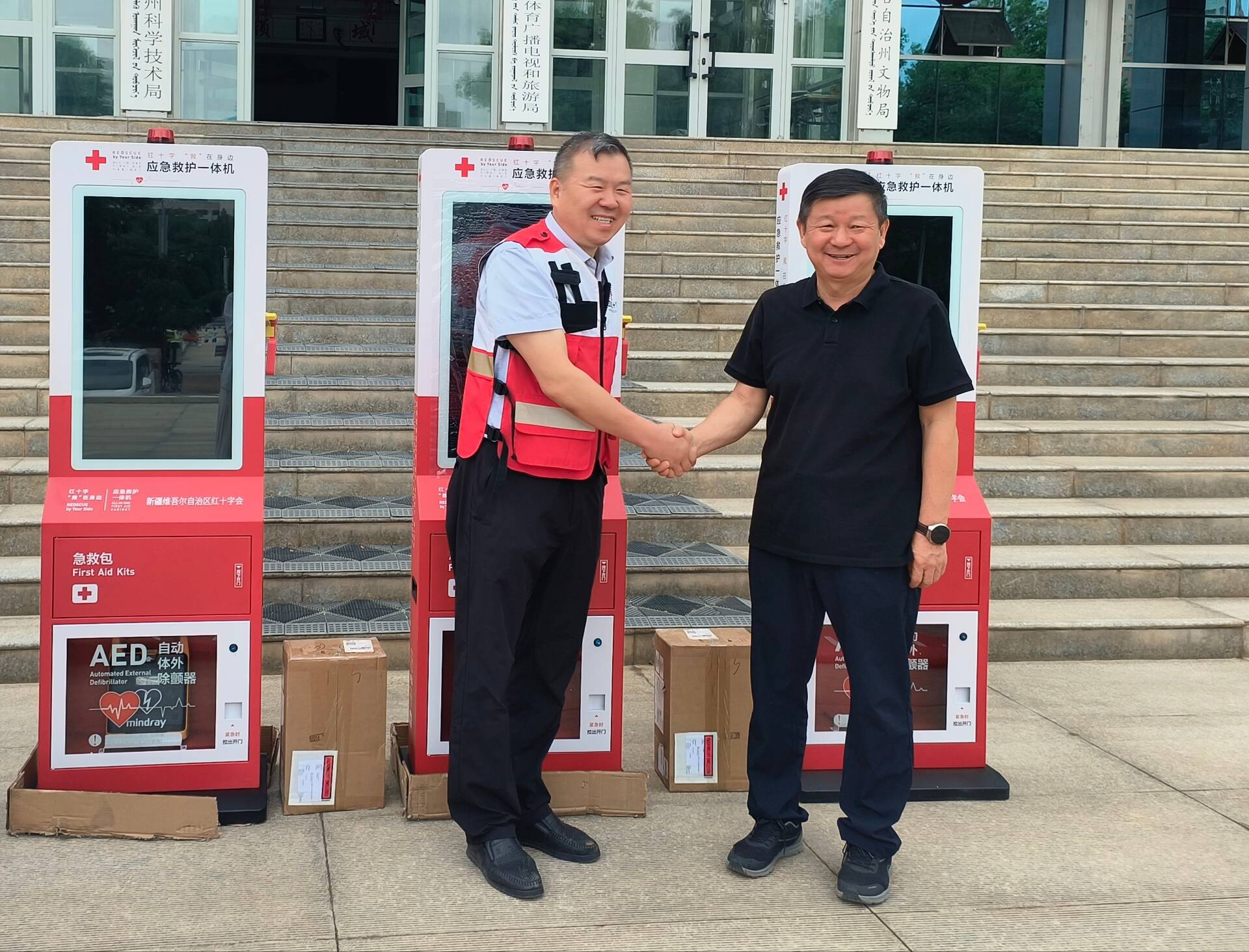 巴州红十字会向巴州纪委监委、巴音郭楞融媒体中心和中交新疆交通投资发展有限公司投放3台应急救护一体机,至此,全州应急救护一体机及自动体外除颤仪(AED)已增至25台。