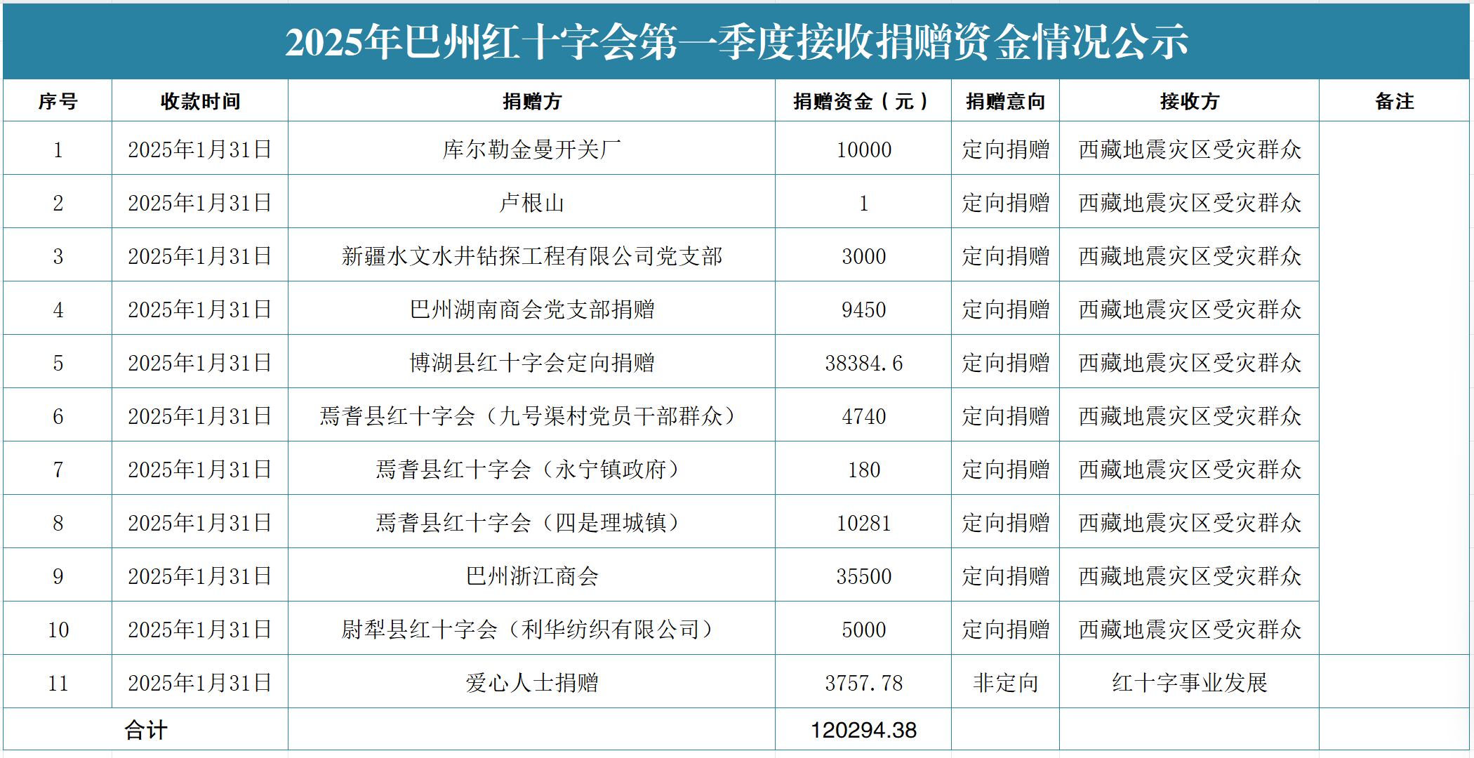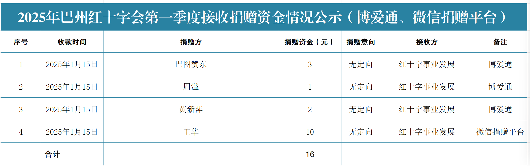 巴州红十字会2025年第一季度捐赠资金情况公示