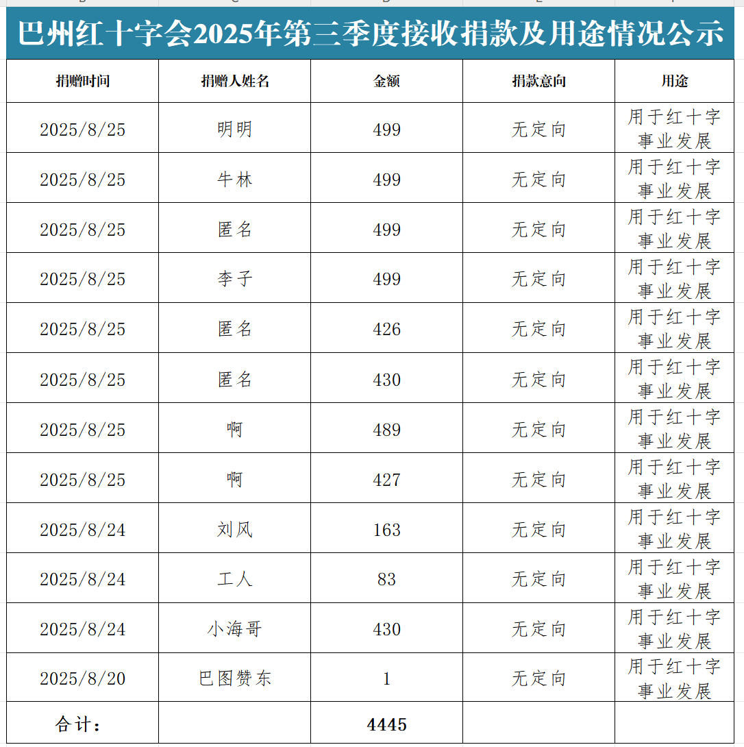 为深入贯彻落实《中华人民共和国红十字会法》《中华人民共和国公益事业捐赠法》《中华人民共和国慈善法》《中国红十字会信息公开标准》,打造公开透明的红十字会,现将巴州红十字会2025年第三季度接收捐款情况公示如下: