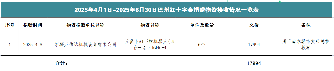为深入贯彻落实《中华人民共和国红十字会法》《中华人民共和国公益事业捐赠法》《中华人民共和国慈善法》《中国红十字会信息公开标准》,打造公开透明的红十字会,现将巴州红十字会2025年第二季度接收捐物情况公示如下: