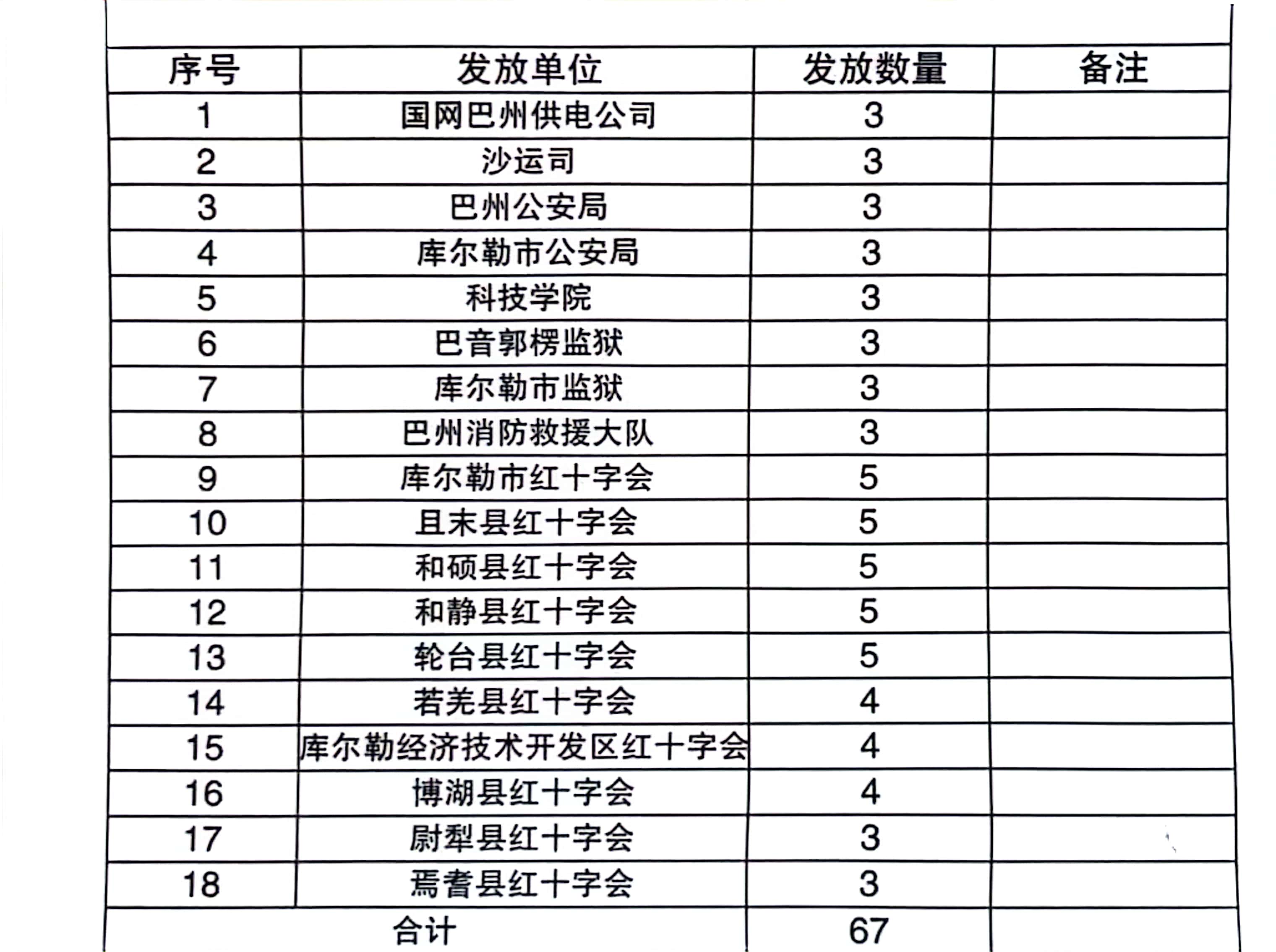 该项目巴州红十字会系统共筹款69172.79元,州红十字会根据各县市红十字会对“新疆应急救护一体机”项目的筹款情况,分配全州人员密集公共场所投放应急救护一体机及AED(自动体外除颤仪),并组织人员进行救护员培训。