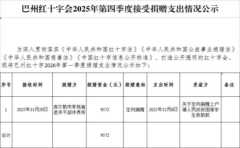 为深入贯彻落实《中华人民共和国红十字法》《中华人民共和国公益事业捐赠法》《中华人民共和国慈善法》《中国红十字信息公开标准》、打造公开透明的红十字会、现将巴州红十字2025年第四季度捐赠支出情况公示如下: