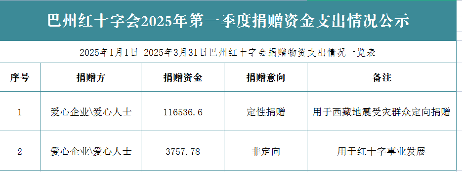 为深入贯彻落实《中华人民共和国红十字会法》《中华人民共和国公益事业捐赠法》《中华人民共和国慈善法》《中国红十字会信息公开标准》,打造公开透明的红十字会,现将巴州红十字会2025年第一季度捐赠物资支出情况公示如下: