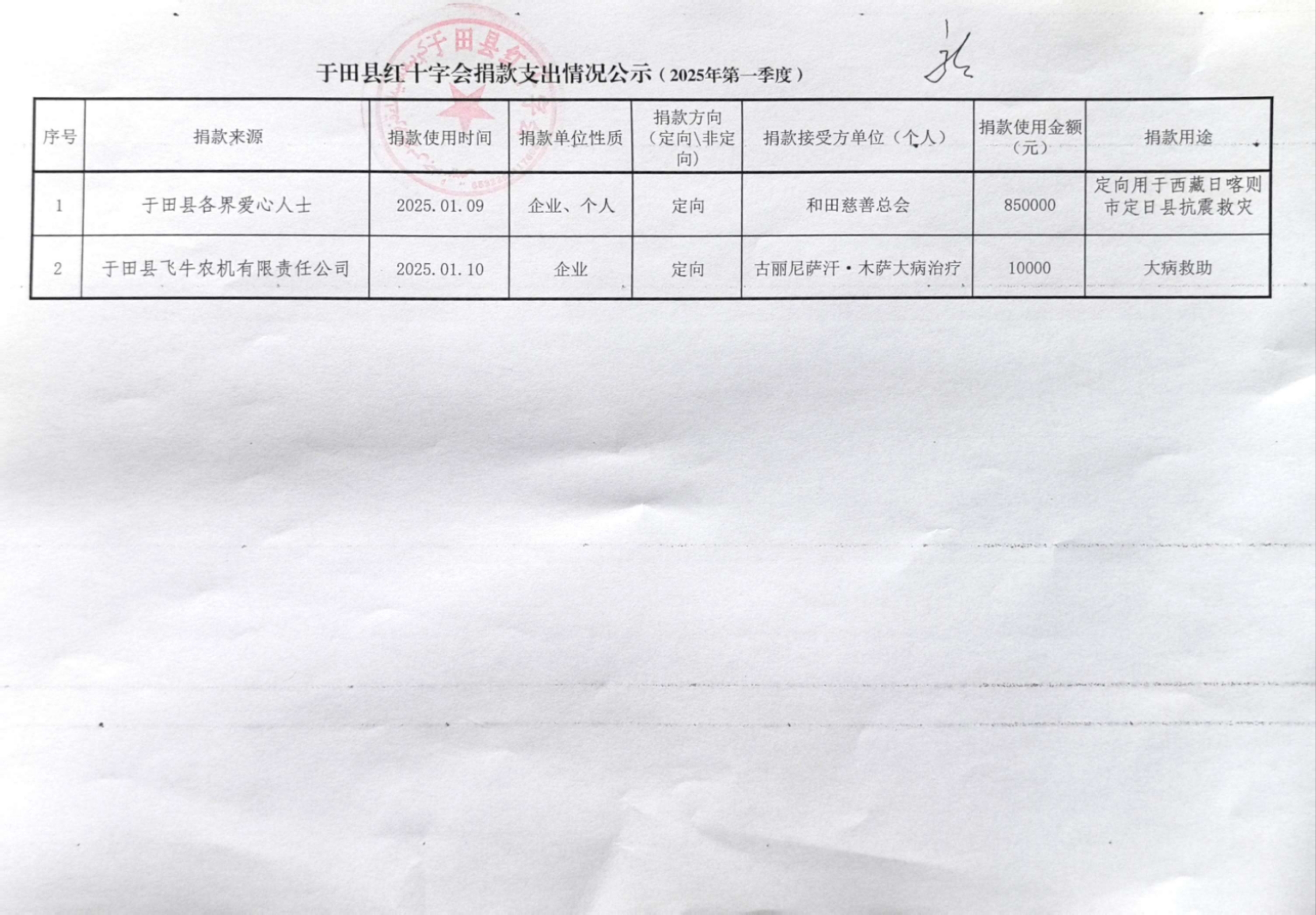 和田地区于田县红十字会第一季度捐款支出情况公示