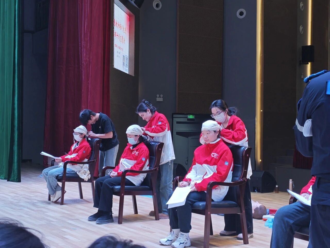 志愿者们在讲师的细致指导下,反复练习胸外按压、人工呼吸及AED设备使用,逐一纠正动作细节,确保按压频率、深度及电击流程精准无误。以及学习不同部位创伤包扎的实用技巧。训练现场学习气氛热烈,学员们神情专注,每个动作都严谨认真、规范到位。