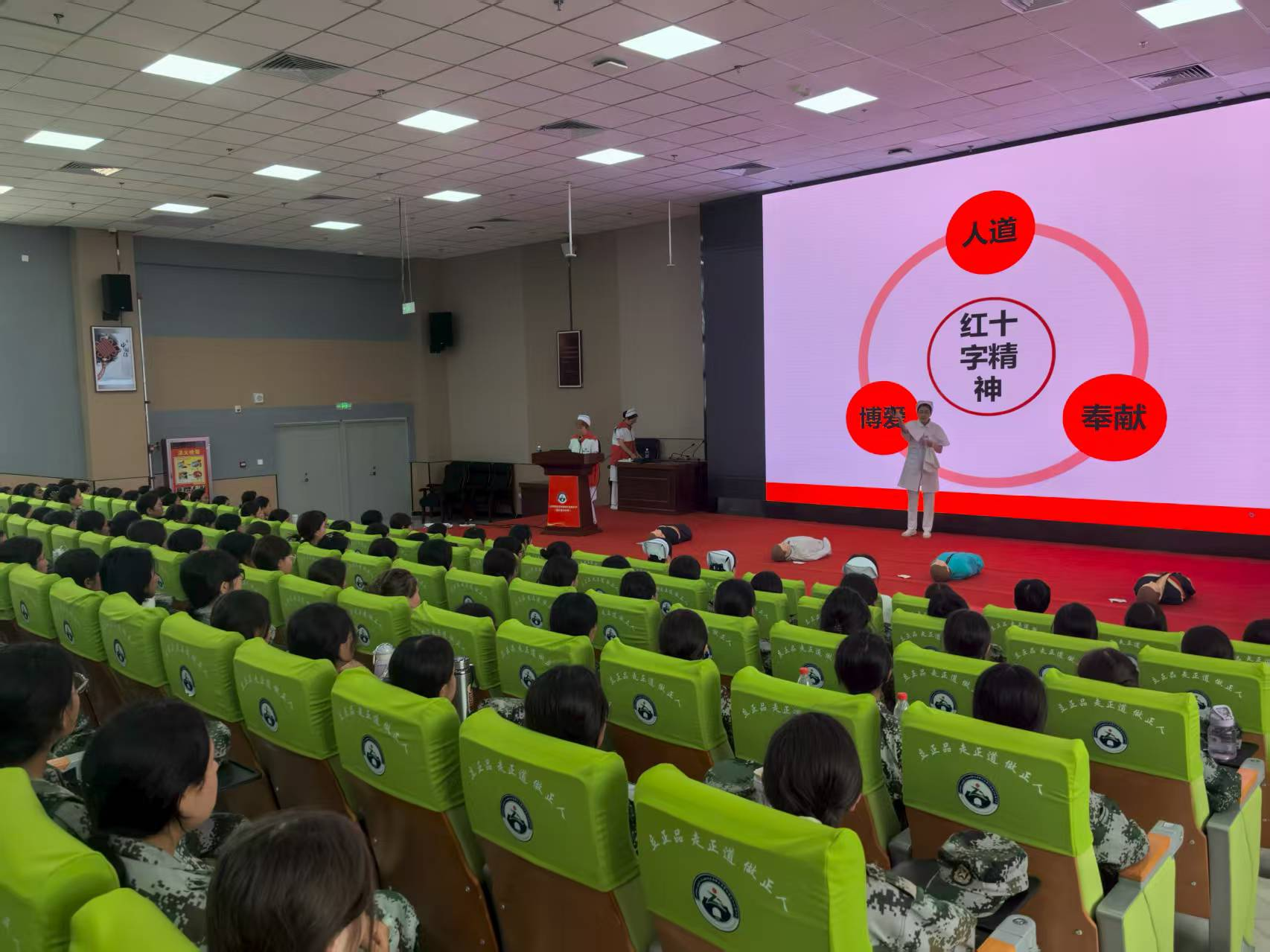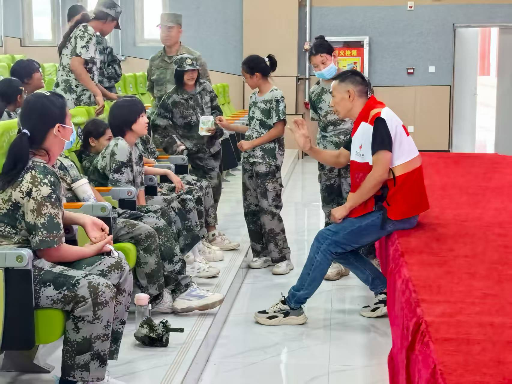 “大家知道红十字标志的由来吗?它不仅是应急救护的象征,更代表着对生命的尊重与守护……” 在军训间隙的休息区,红十字会讲师以生动的历史故事开篇,向同学们介绍了红十字运动的起源、核心精神及中国红十字会的使命担当。通过图片展示、视频短片等形式,讲师将 “人道”“博爱”“奉献” 的抽象理念转化为贴近校园生活的案例:从校园意外中的互助急救,到救灾现场的红十字志愿者身影,让同学们直观感受到红十字精神与日常成长的紧密联系。