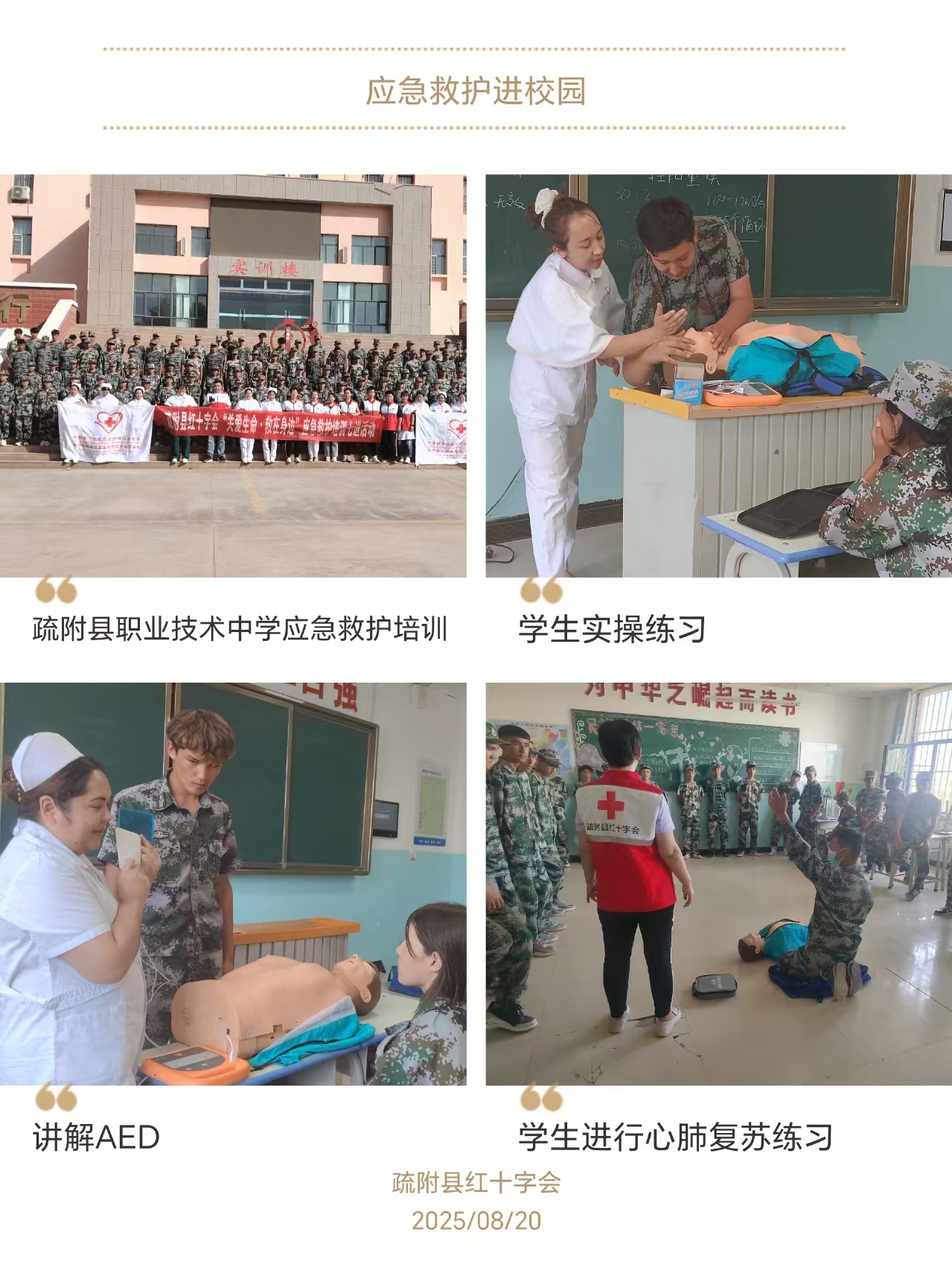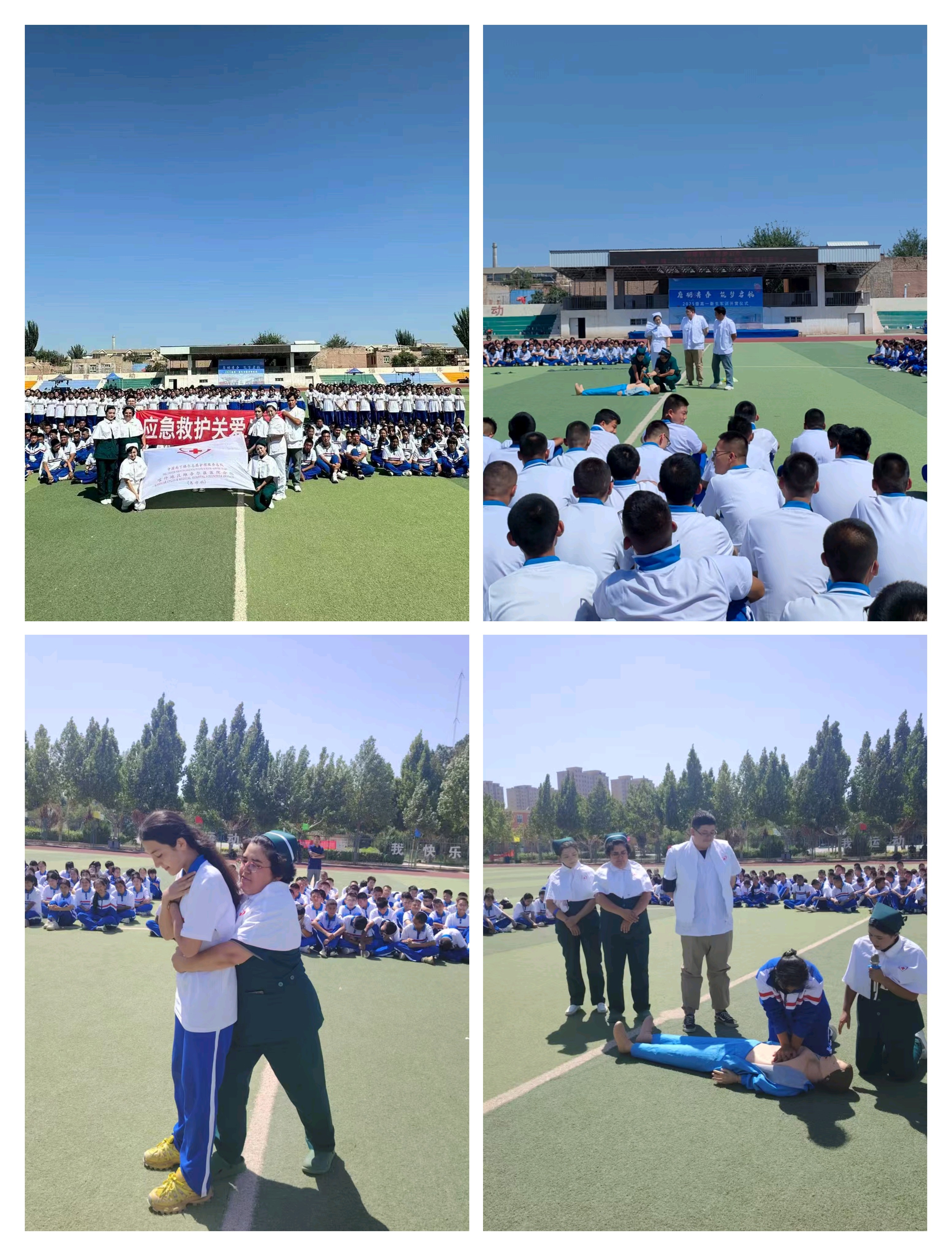 疏附县红十字会开展应急救护进校园活动,投入来自疏附县红十字会、疏附县人民医院南丁格尔志愿服务队和疏附县维吾尔医医院南丁格尔志愿服务队共计18名救护师资,疏附县职业高中600名新生接受培训。(疏附县红十字会)