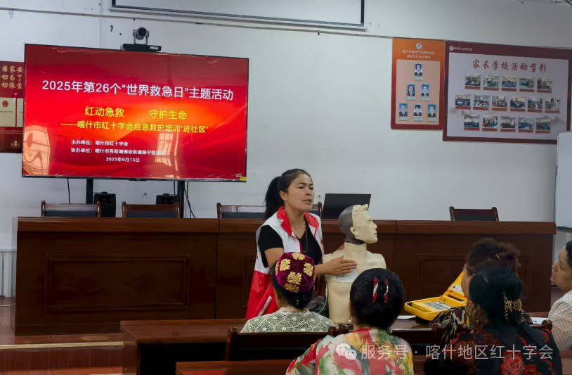 为进一步提升社区居民的应急救护意识和自救互救能力,筑牢社区安全防线,2025年9月13日第26个“世界急救日”之际,喀什市红十字会走进徕宁路社区开展“应急救护进社区”主题活动,为居民重点讲解了心肺复苏(CPR)、海姆立克急救法等关键急救技能,为居民带来实用的急救知识与技能培训,共有20名居民参加活动。