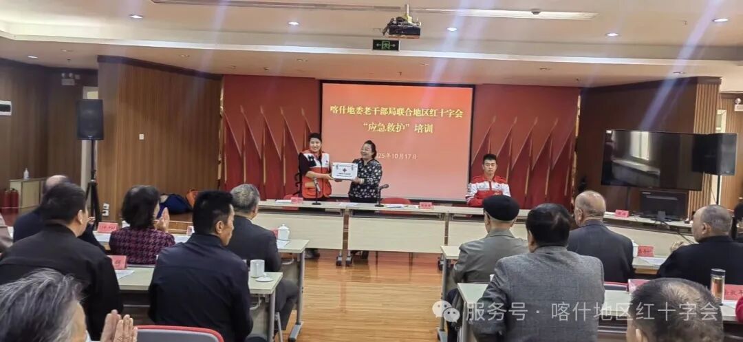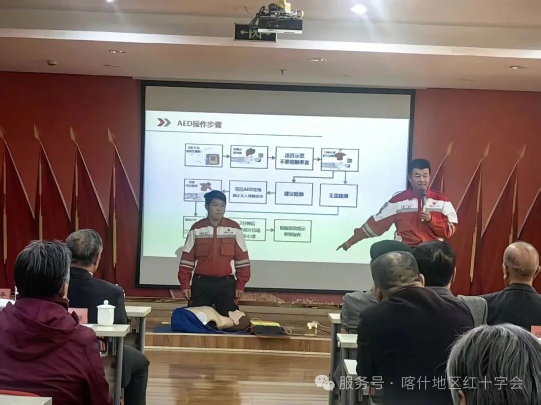 为切实提升喀什地区离退休老干部及其家属和从事老干部工作人员的安全意识和自救互救能力,增强地区离退休老干部安全防范意识,弘扬“人道、博爱、奉献”的红十字精神,普及应急救护知识。10月17日,地区红十字会以“弘扬孝亲敬老美德 共建老年友好社会”为主题,在地区老干部(老年)活动中心开展“应急救护”宣传教育活动。离退休干部、“五老”及其家属、老干部局、关工委全体干部职工100余人参加培训。