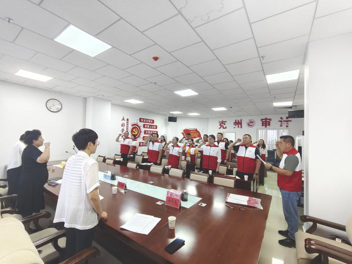 仪式上,克州人民政府副州长、红十字会会长哈力旦·吐尔逊为救援队授旗,赈济救援队全体队员在队长徐天刚带领下进行庄严宣誓。