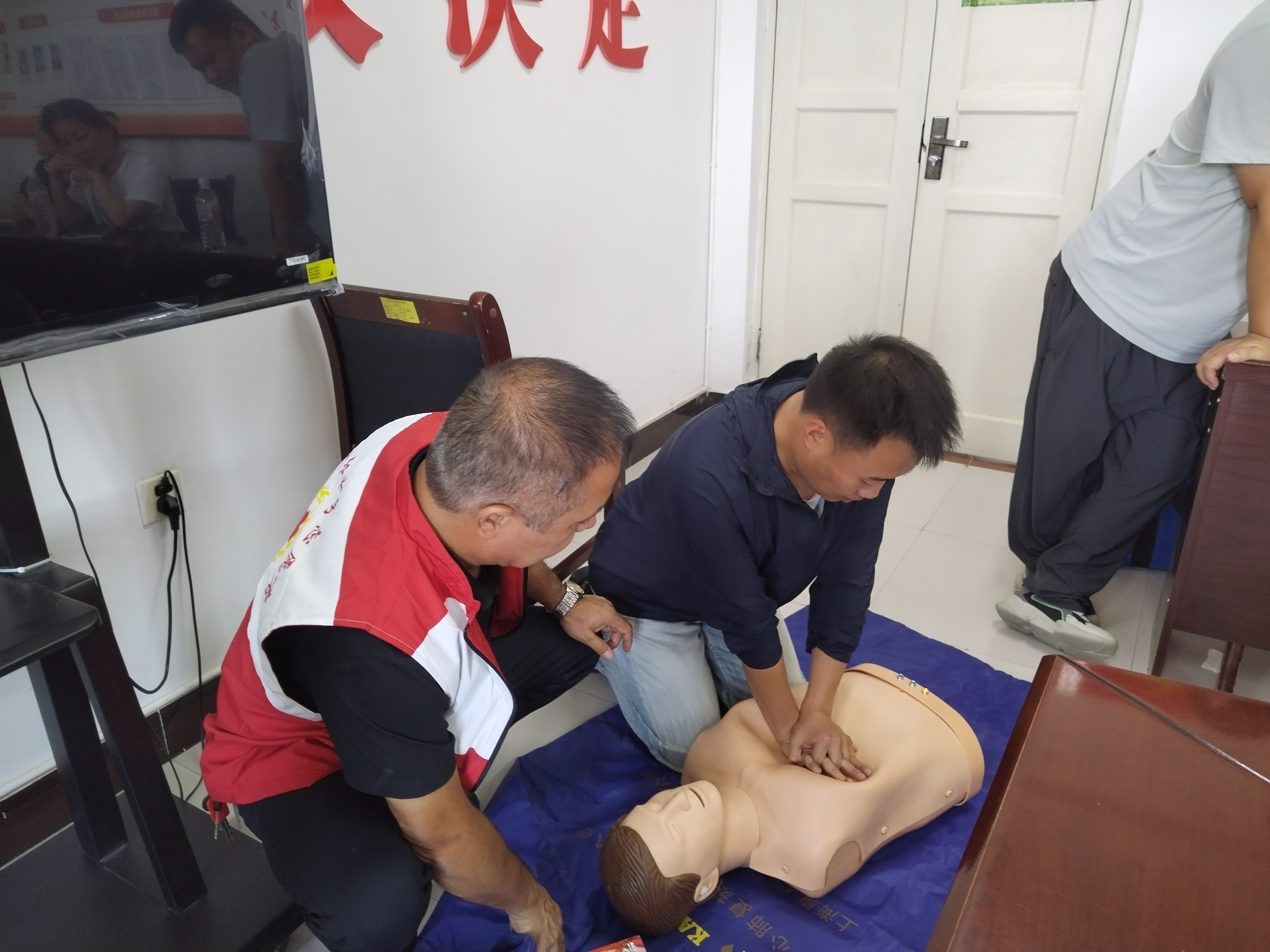 本次培训聚焦“理论+实操”相结合的教学模式,内容贴合日常应急需求。理论环节,红十字会师资讲解急救黄金时间、现场急救原则,以及心梗、中风、中暑等常见急症的识别与初步应对方法;实操环节,重点围绕心肺复苏、自动体外除颤仪使用、成人及儿童的气道异物梗阻解除方法等进行实操演示,一对一指导并纠正动作,确保干部群众“学得会、用得上”。