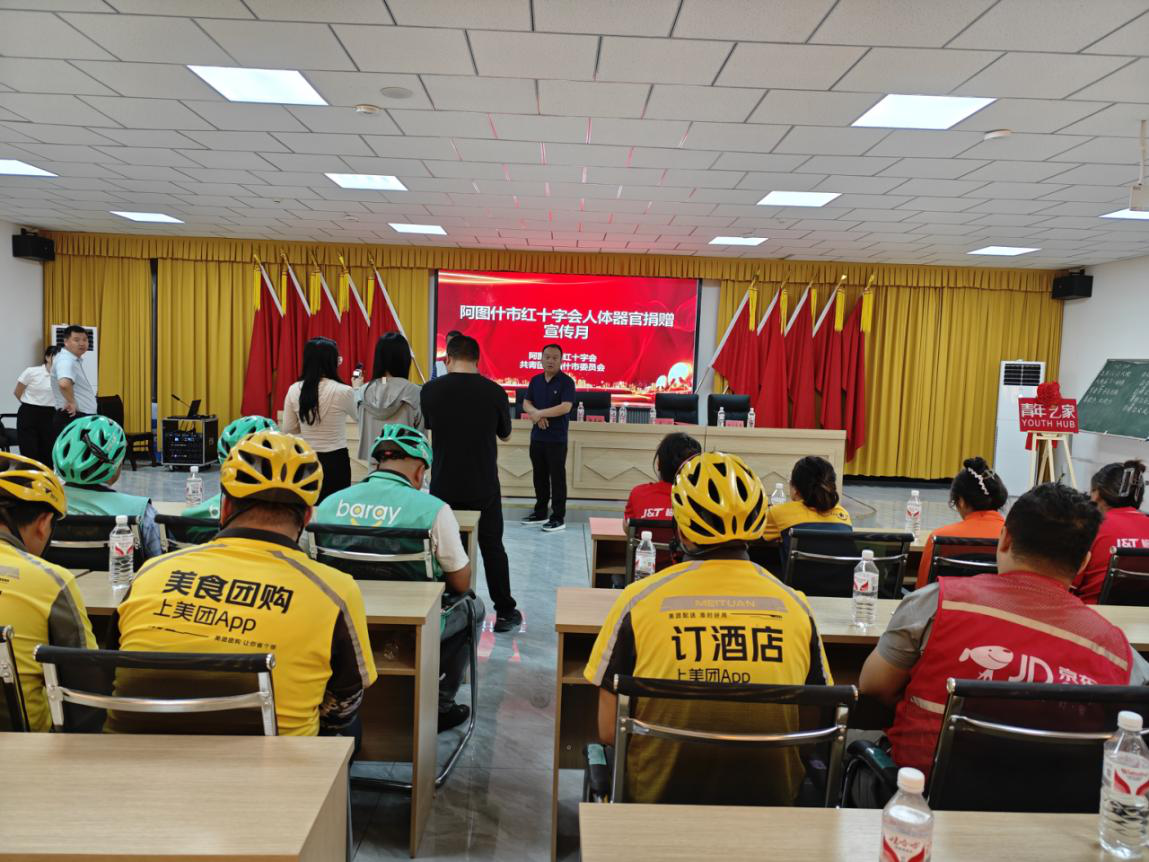 为进一步弘扬“人道、博爱、奉献”的红十字精神,传播“自愿无偿、高尚利他”的人体器官捐献理念 ,7月3日,阿图什市红十字会在光明街道玛纳斯社区对快递、外卖员工开展了“矢志人道 ·携手同行”为主题的人体器官捐献宣传月活动,活动取得良好效果,得到居民广泛关注与积极响应。