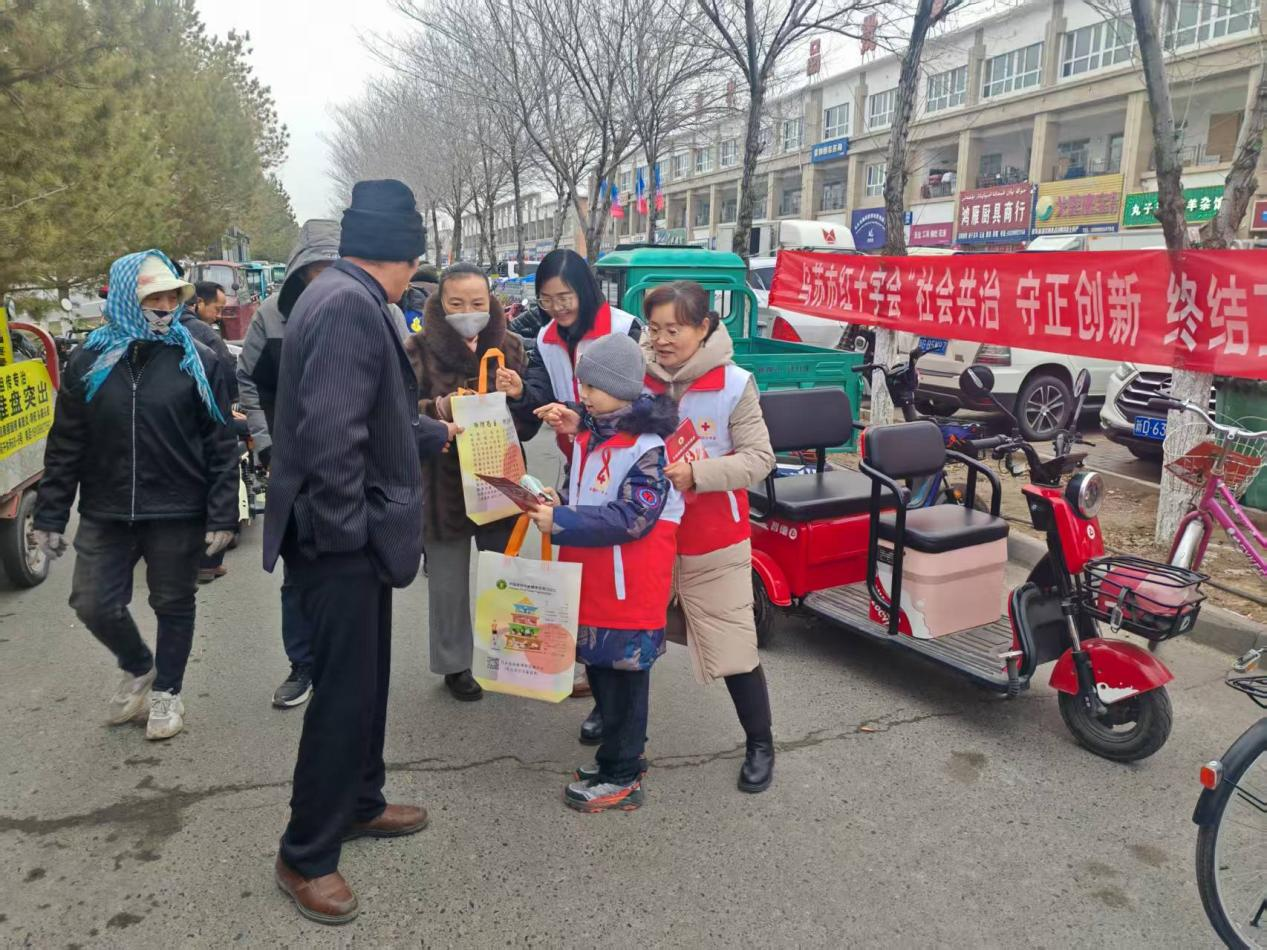 乌苏市红十字会在北园春市场门口联合市卫健委、疾控中心、各大医院、公安局等多个单位开展宣传活动。通过在醒目位置悬挂横幅,传递防艾共治的社会理念,宣读《终结艾滋倡议书》,呼吁广大市民主动学习防艾知识、远离高危行为、关爱感染者群体、参与防艾行动,倡导全社会凝聚共识、携手发力,共同筑牢防艾防线。