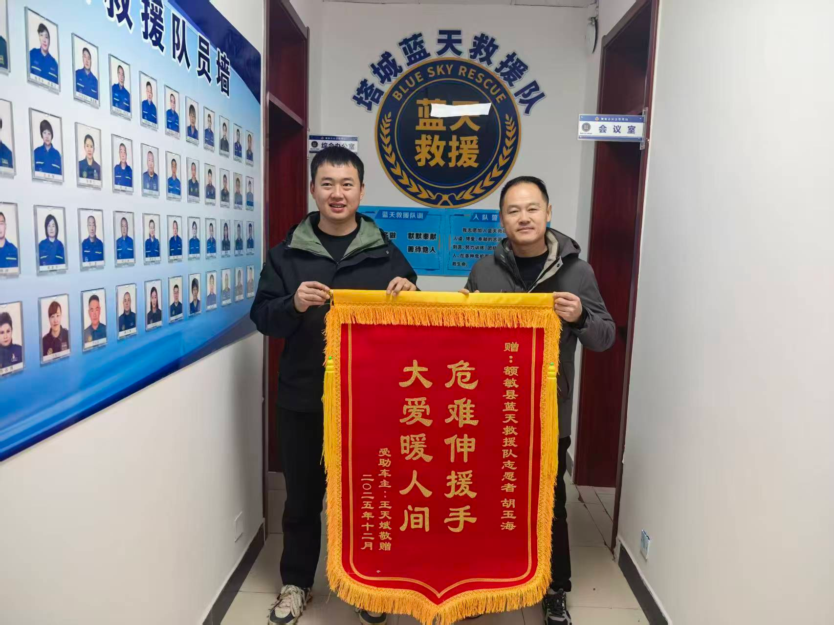 1月15日在托里县阿合别斗乡开展风雪车辆救援,受益人回馈锦旗,塔城蓝天救援队出动1车1人,服务时长4小时。