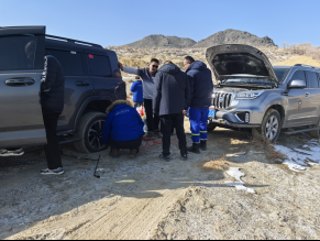 2月22日塔城蓝天救援队在和布克赛尔蒙古自治县龙脊骨拉练途中,遇到群众车辆被困,现场进行车辆补胎,出队2车8人,服务时长3小时。
