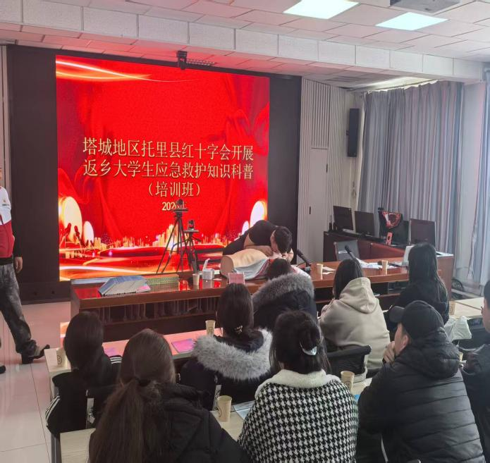 1月13日,塔城地区托里县红十字会开展返乡大学生应急救护知识普及活动,70名返乡大学生参加此次培训?;疃劢骨嗄耆禾灏踩枨?,旨在提升返乡大学生的应急救护能力,培养其志愿服务意识,为家乡平安建设注入青春力量。