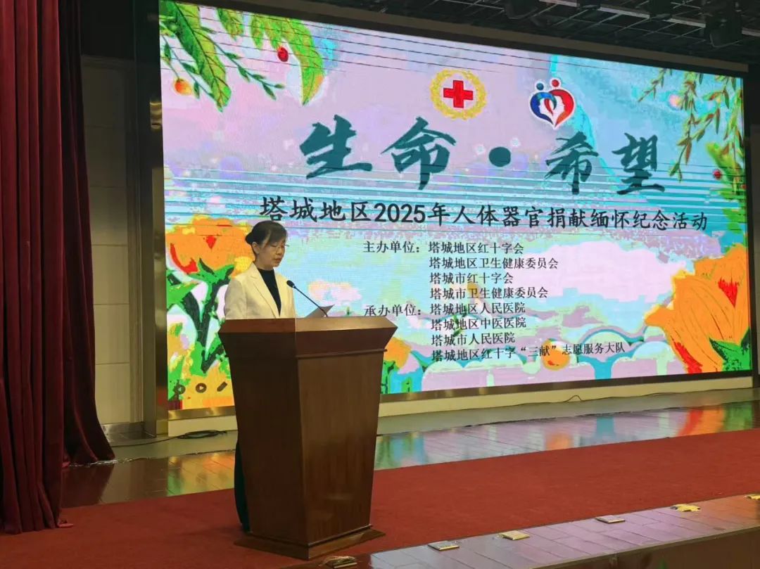3月26日,塔城地、市红十字会联合卫健委开展“生命·希望”人体器官捐献缅怀纪念活动。地区红十字会党组书记、副会长刘艳艳,地区卫健委党组成员、副主任,地区疾控局局长巴合达提·努尔木卡西出席活动并讲话。红十字会干部、卫生系统医护人员、遗体和人体器官捐献者家属、红十字“三献”志愿服务大队志愿者参加活动。