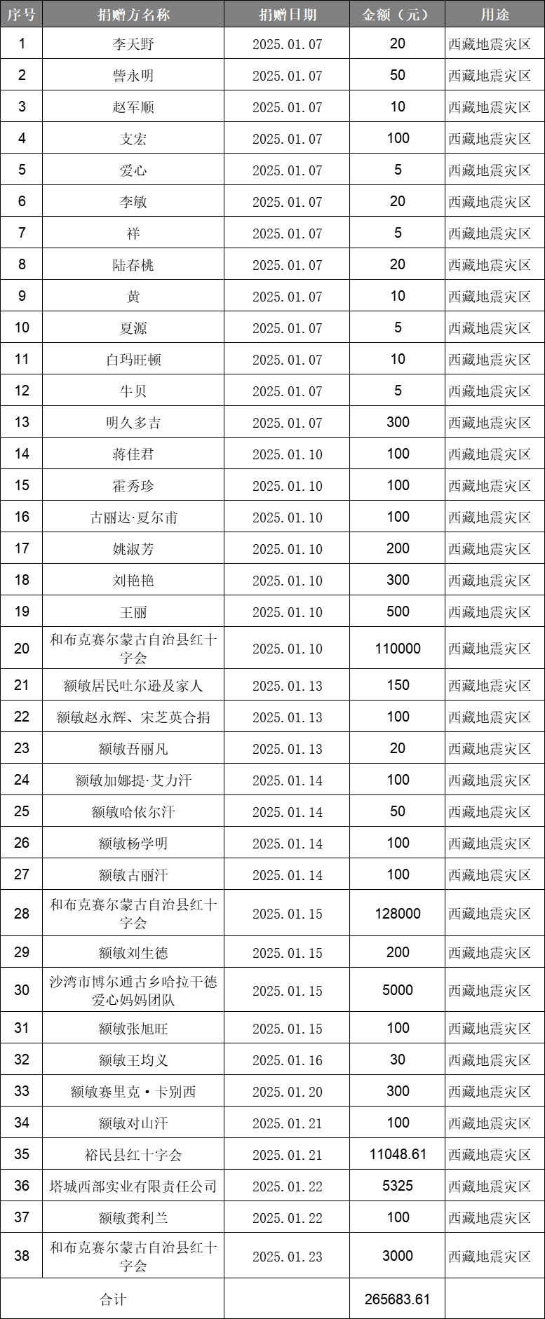 自2025年1月7日-1月25日,塔城地区红十字会累计接收社会各界爱心人士、团体、企业向西藏地震灾区捐款265683.61元,现予以公示。