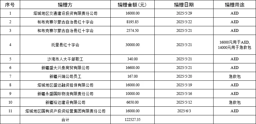 根据自治区红十字会《关于开展2025年全区红十字系统“5·8人道公益日”筹资活动的通知》(新红办〔2025〕7号)要求,塔城地区红十字会参与了新疆红十字基金会急救计划AED、急救计划急救包2个共建项目。截止2025年6月10日20:00,共筹集资金292902.37元,其中:急救计划AED项目筹集资金177435.85元,急救计划急救包项目筹集资金115466.52元。