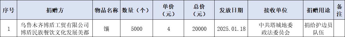 2025年 1月18日,塔城地区红十字会按照爱心企业捐赠意愿,将5000个馕全数移交塔城地委政法委,由塔城地委政法委按县(市)实际情况分配给护边员队伍,现予以公示。