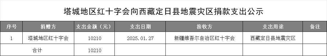 自2025年1月26日-2月4日,塔城地区红十字会累计接收社会各界爱心人士、团体、企业向西藏地震灾区捐款10210元,按照新疆维吾尔自治区红十字会统一安排部署,由新疆维吾尔自治区红十字会汇总后统一转往地震灾区,现予以公示。