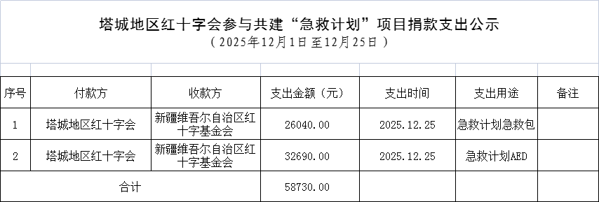 2025年12月1日至12月25日,塔城地区红十字会参与共建的新疆维吾尔自治区红十字基金会携手推出的“急救计划AED”,“急救计划急救包”,“博爱送万家”3个项目共筹集资金 58730元,已全部转入新疆维吾尔自治区红十字基金会账户,所有捐款按照项目资金用途采购物资。现将捐款支出情况公示如下: