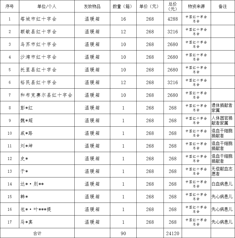 2025年塔城地区红十字会接收自治区红十字会一批“红十字博爱送万家”物资,价值24120元的温暖箱90个,已通过地区及县(市)红十字会发放完毕。现将具体发放情况予以公示。