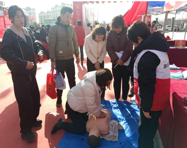 活动聚焦群众所需,精准开展便民服务。在年货大集现场设置应急救护教学区,专业师资手把手教授心肺复苏、海姆立克急救法等实用技能,普及自救互救知识;联合南丁格尔志愿护理服务队同步开展健康义诊,为群众测量血压、血糖,提供健康指导。志愿者通过发放宣传资料、现场答疑,积极开展“三献”知识宣传,引导群众参与生命接力事业。