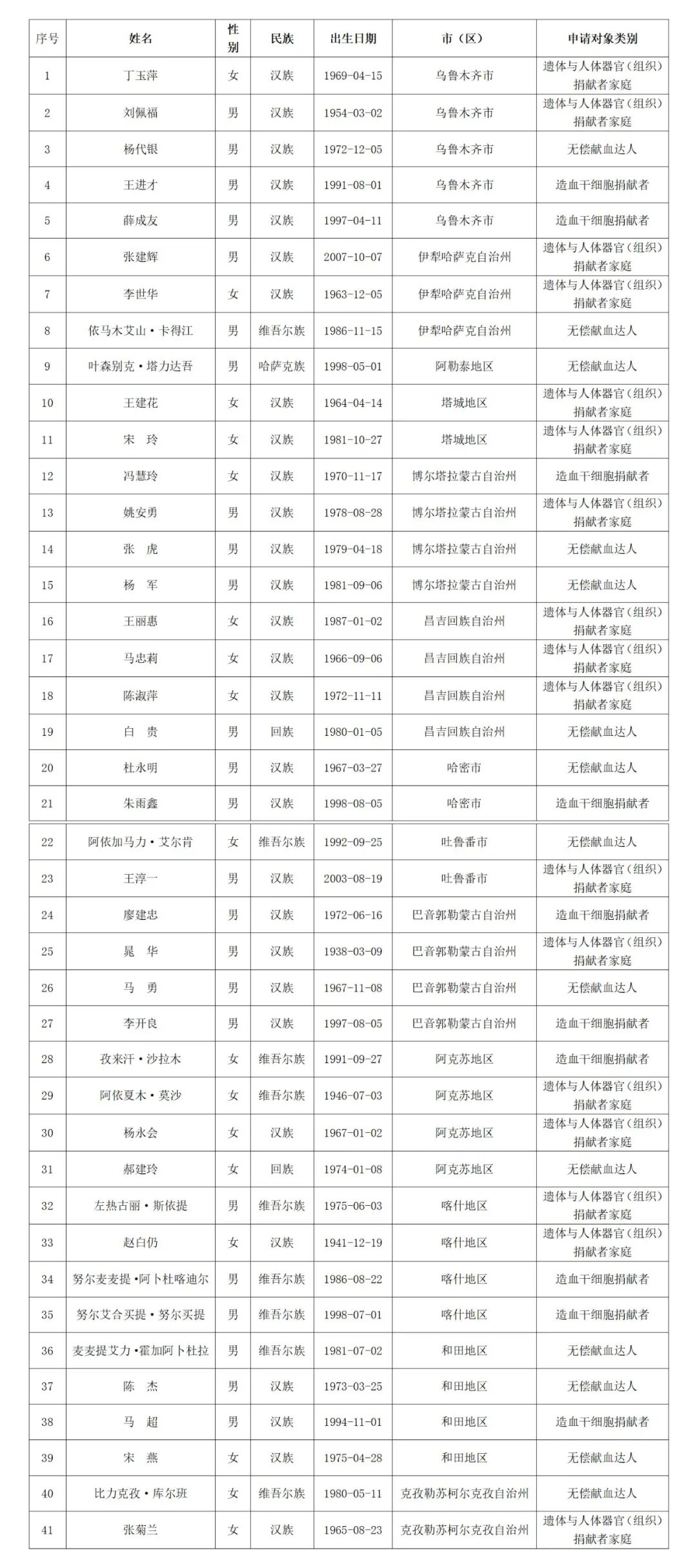 由申请家庭自主填报申请材料,户籍所在县(市、区)红十字会初审、地(州、市)红十字会复审、新疆红十字基金会终审。现对41名符合资助条件的人员予以公示,公示期为3天。公示期间,如有异议,请以书面形式向新疆红十字基金会反映(联系电话:0991-2565287;传真:0991-5151606;地址:乌鲁木齐市天山区延安路 773 号会机关楼;邮编:830049)。2025年5?8人道公益日“博爱天山生命接力”众筹项目资助名单