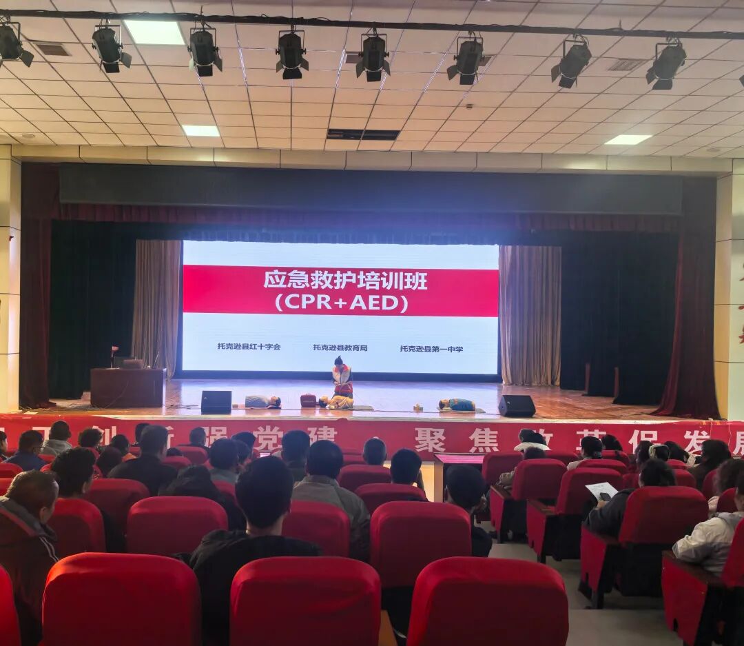 为提升教职工应对突发状况的处置能力,守护师生生命安全,10月30日,托克逊县红十字会联合县教育局,在第一中学成功举办第一期教育系统应急救护(CPR+AED)培训班。来自教育系统各中小学、幼儿园的100余名教职工参加了培训,为师生生命安全“充电赋能”。通过理论教学与实操演练,系统掌握心肺复苏(CPR)、自动体外除颤器(AED)使用、气道异物梗阻处置等“救命技能”,切实提高大家的救护意识和自救互救能力。