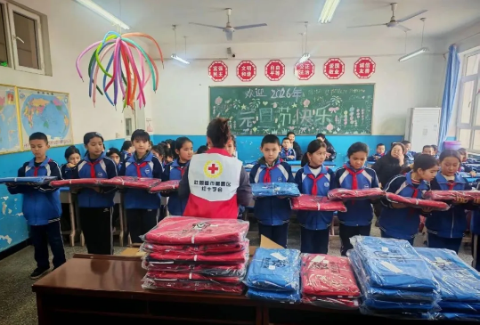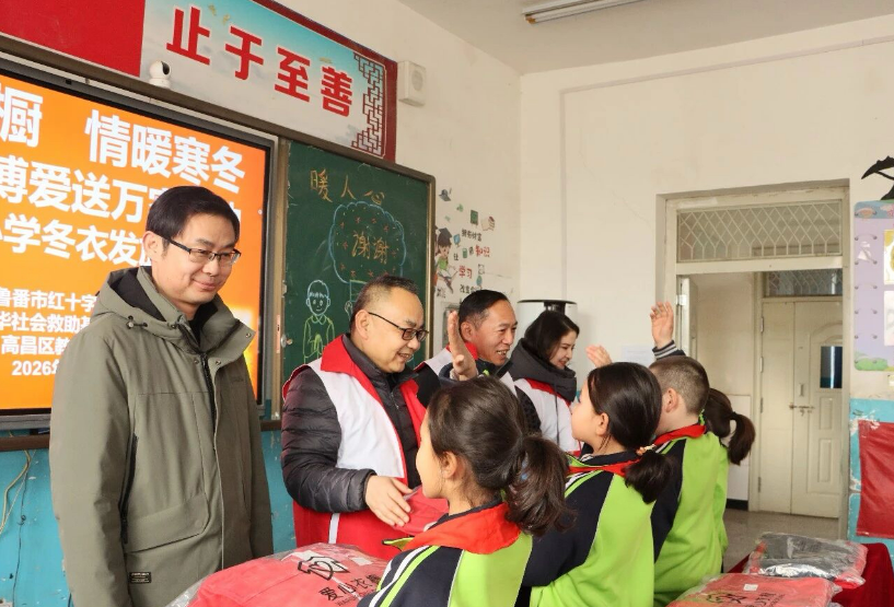 为弘扬人道、博爱、奉献的红十字精神,贯彻党的二十届四中全会精神,扎实推进中华民族共同体意识,1月7日,高昌区红十字会组织开展2026年“博爱送万家·爱心衣橱——为乡村小学生送冬衣”物资发放活动,为全区原种场小学、恰特喀勒乡庄子小学、胜金乡阿克塔木小学、大河沿镇学校、火焰山镇古城小学5所乡村小学近1400名学生,送上价值19万元以上的冬季冲锋衣两件套,让孩子们在寒冬中感受社会大家庭的温暖,喜迎新春佳节。