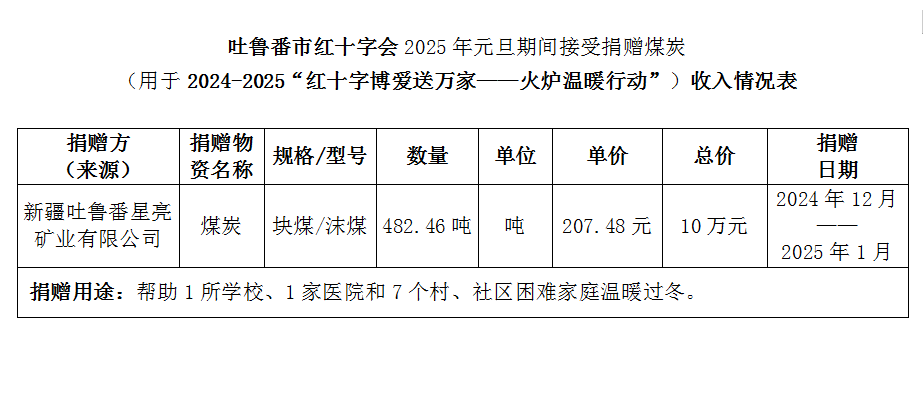吐鲁番市红十字会2025年元旦期间接受捐赠煤炭公示