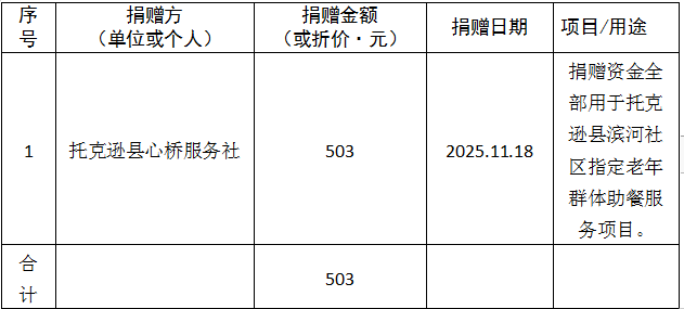 2025年11月18日,托克逊县红十字会接收托克逊县心桥服务社用于滨河社区指定老年群体助餐服务项目的定向捐赠资金,共计1笔503元人民币。