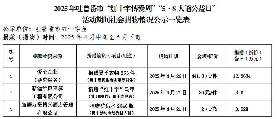 吐鲁番红十字会2025年4-5月接受捐物情况公示