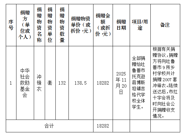 2025年11月,吐鲁番市红十字会接收中华社会救助基金会捐赠的132套御寒冬衣(冲锋衣),定向捐赠给托克逊县博斯坦正吉格代学校全体师生,折合人民币共计18282元人民币。