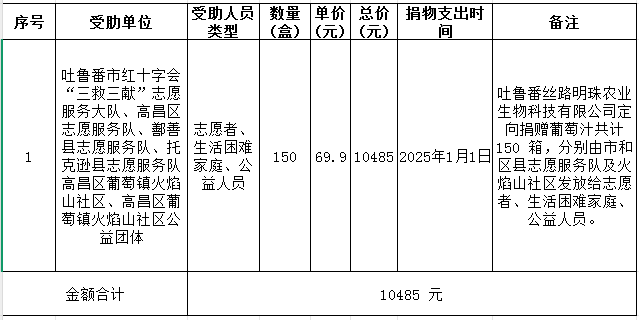 2024年12月,吐鲁番市红十字会接受吐鲁番丝路明珠农业生物科技有限公司自愿捐赠的葡萄汁150箱(每箱10袋)、价值10485元(每箱69.9元),目前已按照定向捐赠意愿分配发放完毕,分别用于2025年“红十字博爱送万家”活动期间慰问市和区县红十字志愿服务队志愿者以及高昌区葡萄镇火焰山社区困难和公益群体。