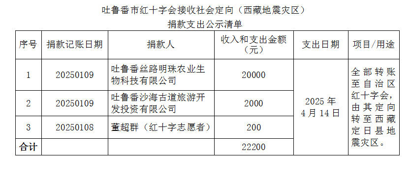 2025年4月14日,吐鲁番市红十字会将2025年1月收到的社会定向捐款3笔、共计22200元全部转账至新疆维吾尔自治区红十字会有关账户,将由自治区红十字会转至西藏定日县地震灾区。