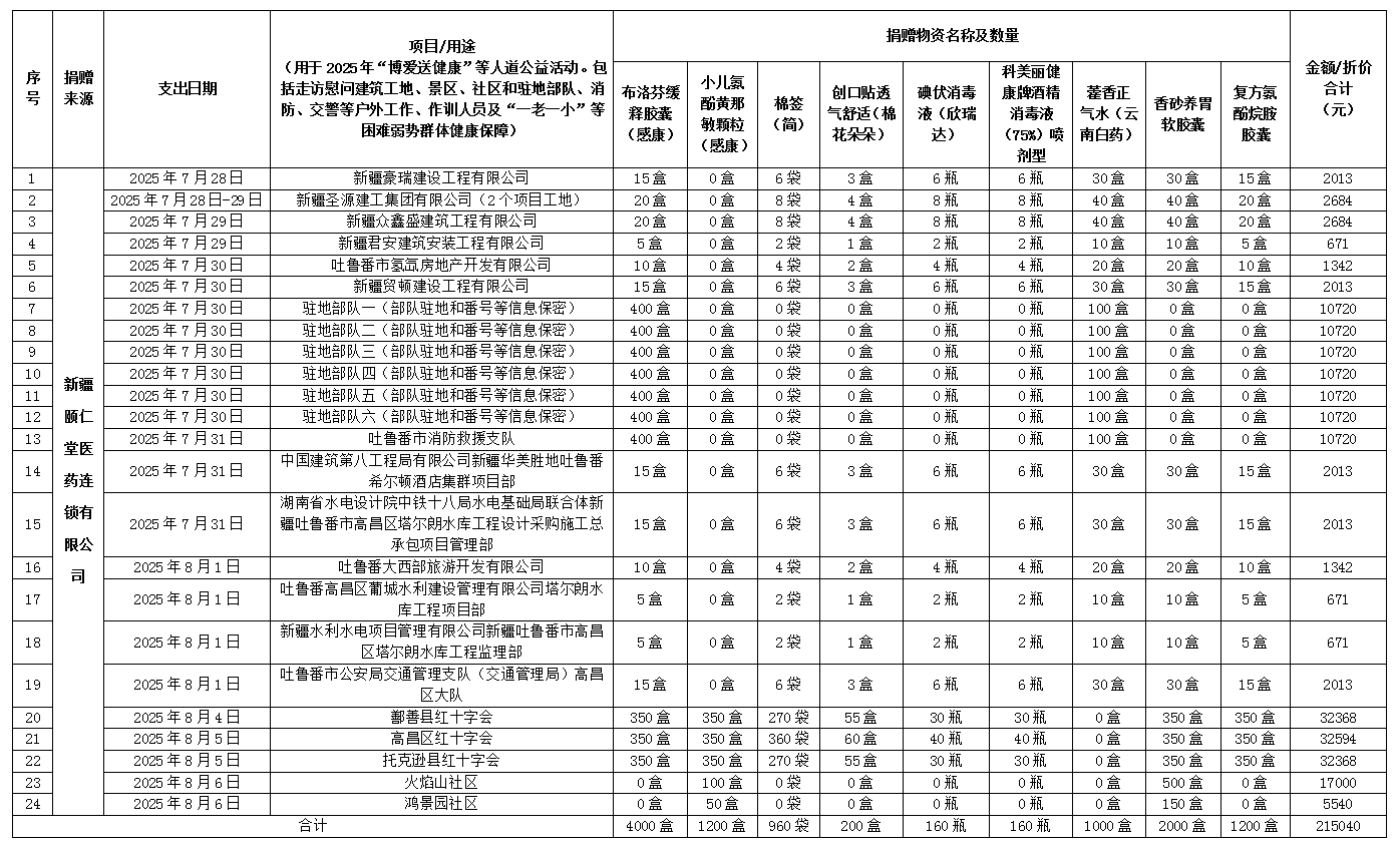 按照有关规定,现将2025年“红十字博爱送健康——关爱生命、守护健康”活动期间,新疆颐仁堂医药连锁有限公司捐赠的价值215040元的药品物资分配使用情况予以公示(详见下表)。