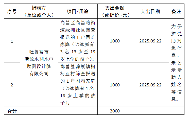 2025年7月,吐鲁番市清源水利水电勘测设计院有限公司向吐鲁番市红十字会捐款人民币2000元,已按定向捐款协议将捐款分别转入高昌区高昌路街道绿洲社区、鄯善县辟展镇柯柯亚村各1名困难学生家庭账户。