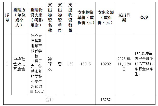 2025年11月,吐鲁番市红十字会接收中华社会救助基金会捐赠给吐鲁番市乡村学校小学生的一批御寒冬衣(冲锋衣),折合人民币共计18282元人民币,现已发放至托克逊县博斯坦镇吉格代学校。