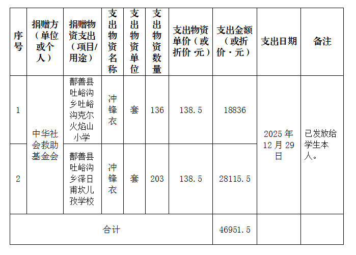 2025年12月,吐鲁番市红十字会接收中华社会救助基金会捐赠给吐鲁番市乡村学校小学生的一批御寒冬衣(冲锋衣),当月已将其中折合人民币46961.5元的339套发放给鄯善县2所乡村学校学生。