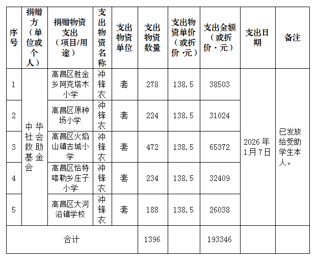 2025年12月,吐鲁番市红十字会接收中华社会救助基金会捐赠给吐鲁番市乡村学校小学生的一批御寒冬衣(冲锋衣),2026年1月已将其中折合人民币193349元的1396套发放给高昌区5所学校学生。
