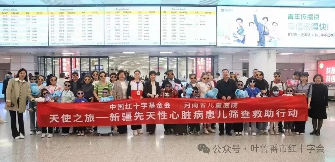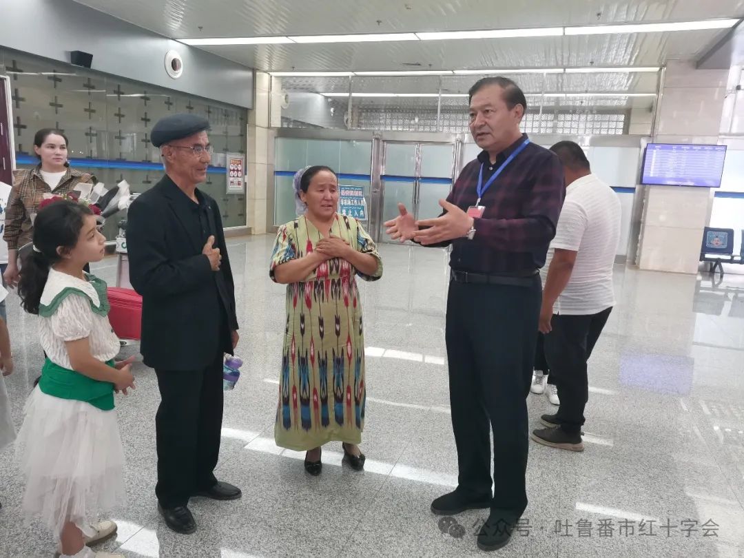 4月26日,出院后的患儿及家长等随行人员从郑州出发,当日19:30抵达吐鲁番交河机场,吐鲁番市委分管领导带领红十字会工作人员和有关爱心企业负责人一起到机场迎接他们顺利归来,并为他们送上了爱心企业带去的中国红十字会成立120周年纪念邮票、毛绒玩具和鲜花等礼物。