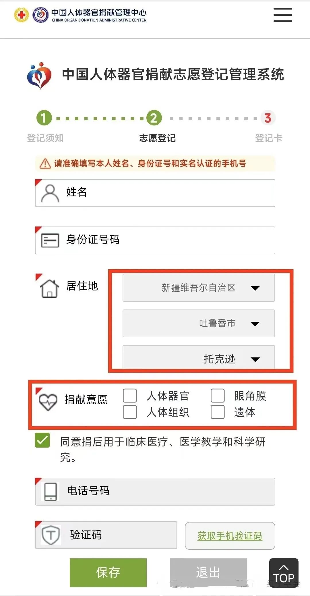 4:正确填写姓名、身份证、居住地,(新疆维吾尔自治区-吐鲁番-托克逊),捐献意愿(可单选、也可多?。?,联系电话等基本信息完成登记。