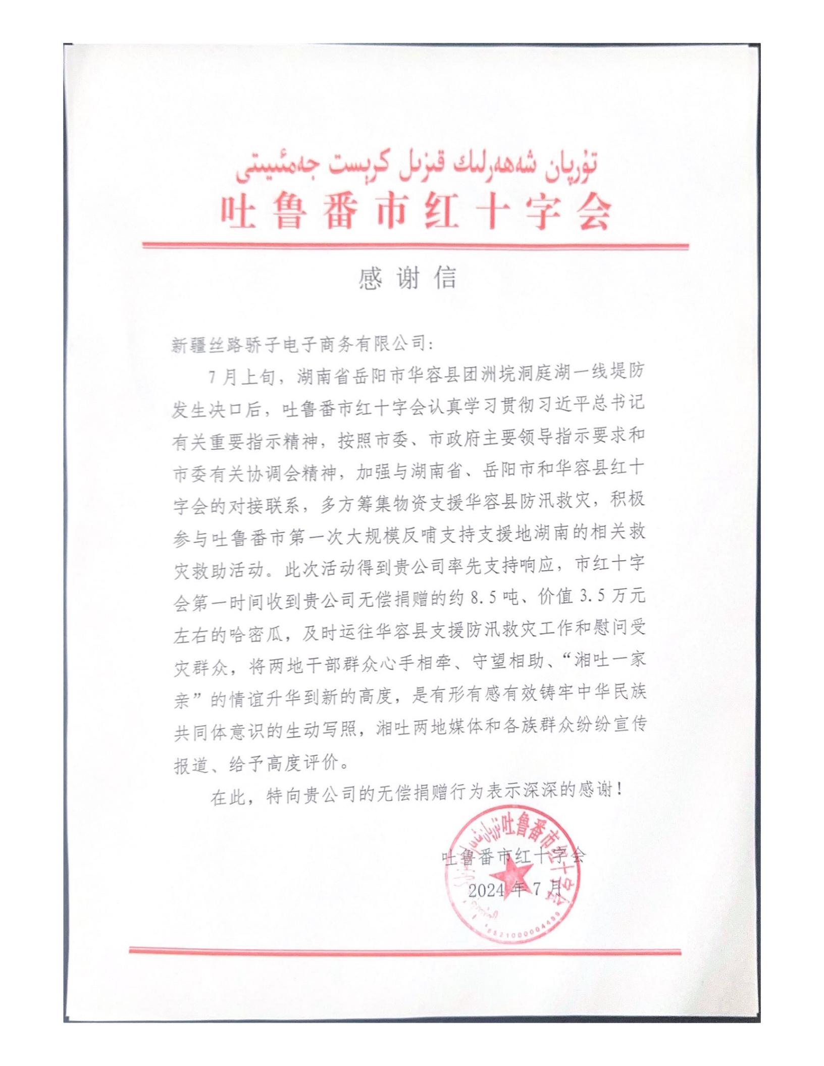 为表示对新疆丝路骄子电子商务有限公司无偿捐赠的人道主义行为的肯定和感谢,市红十字会向该公司发放捐赠证书并代表市委致感谢信。