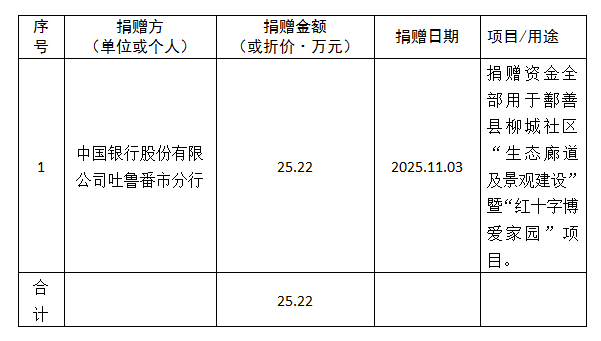 2025年11月3日,吐鲁番市红十字会接收中国银行股份有限公司吐鲁番市分行用于鄯善县鲁克沁镇柳城社区“生态廊道及景观建设”暨“红十字博爱家园”项目的定向捐赠资金,共计1笔25.22万元人民币。