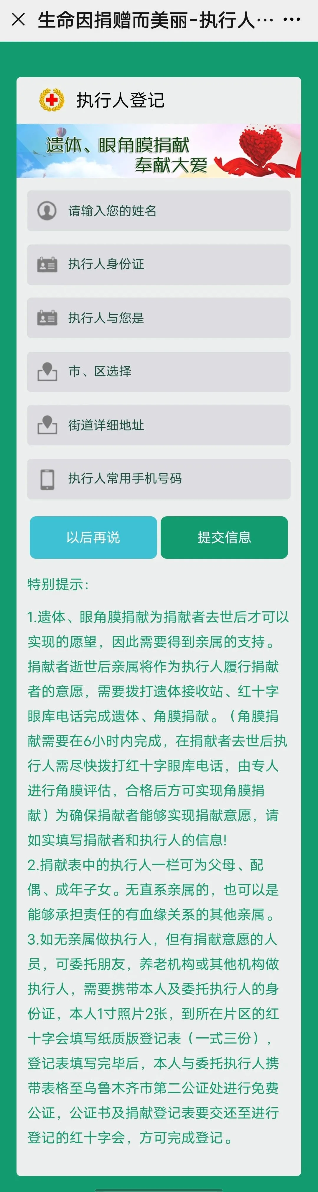 三、 信息填写完整,点击最下方一行同意协议,确认无误后点击提交信息,进入执行人登记界面(如下图),(此页是执行人的基本信息为必填项),填写前请仔细阅读特别提示。