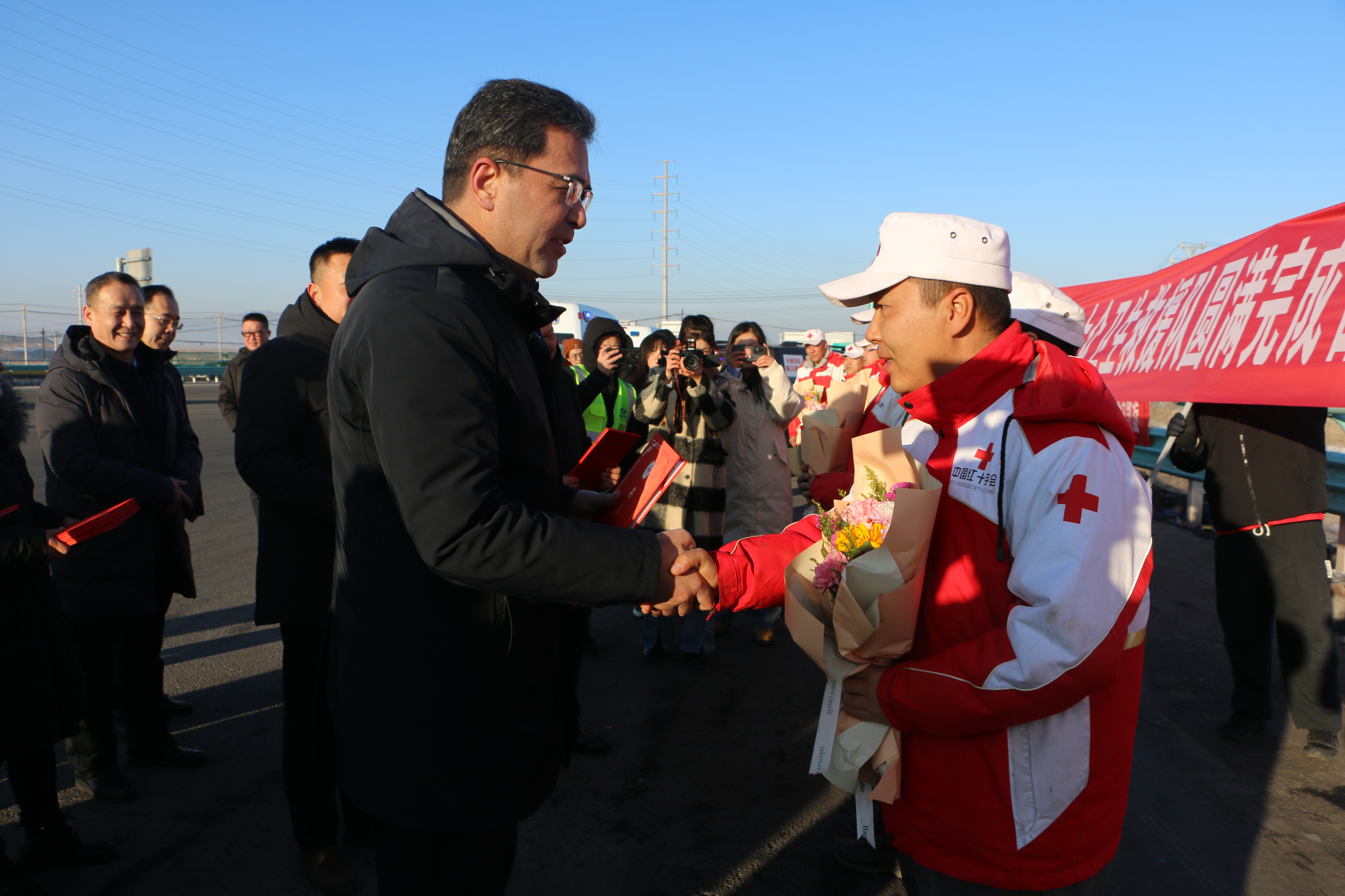 自治区红十字会领导及工作人员在乌拉泊北高速收费站出口迎接救援队队员们,与他们一一握手拥抱,并颁发证书、献上鲜花。